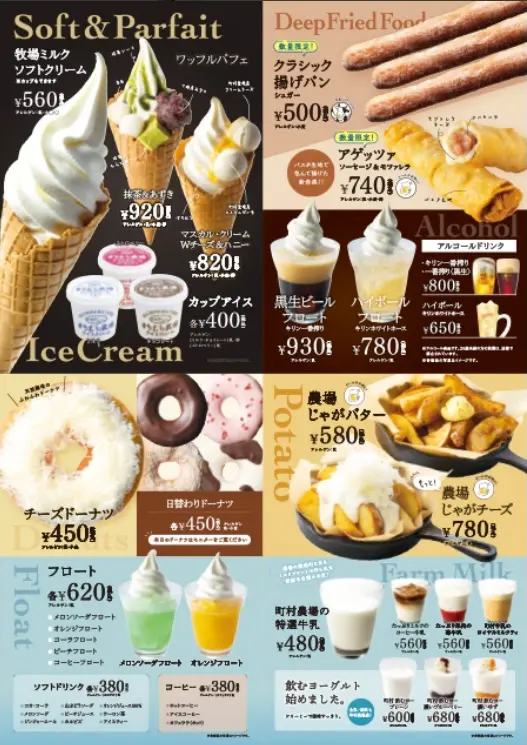 江別の牧場で搾乳された新鮮で美味しい牛乳を使用した牧場ミルクのほか、独自の酵母を使用したドーナツなどひんやりスイーツからホットなスイーツとラインナップ豊富!