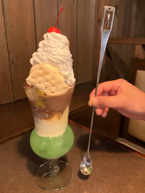 パフェは25センチくらいだと思います。1番下はメロンソーダ。デカ盛りヤッホー♪