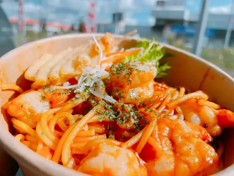 いつもガーリックシュリンプ(850円)を食べるのですが、この日はエビソースパスタ(850円)も購入。