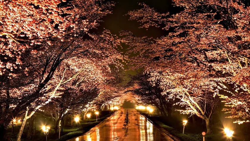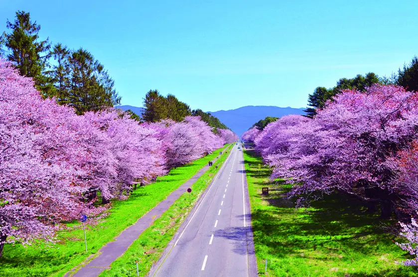全長7kmにもおよぶ直線道路の両側に、約2,000本の桜が咲き誇るその光景は圧巻。まるで桜のトンネルをくぐっているかのような感覚を味わえます。