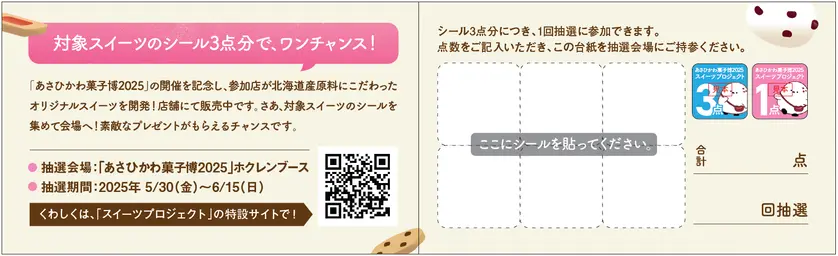 対象のスイーツのシール3点分を集めて、あさひかわ菓子博2025の会場内ホクレンブースに行くと、素敵なプレゼントがもらえる抽選会に参加できます。
