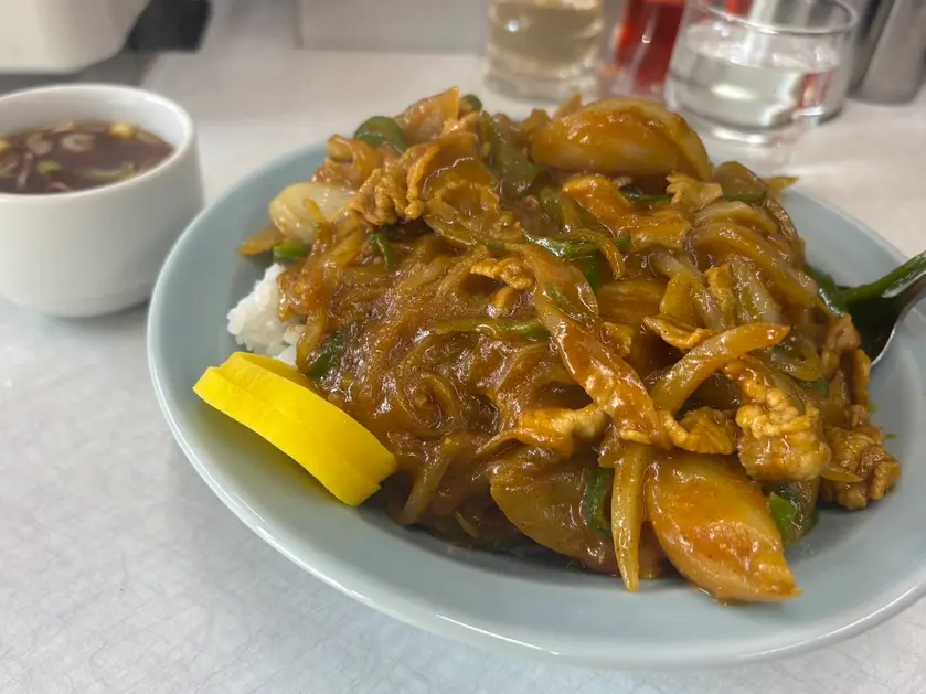 皆さん、おわかりいただけたでしょうか?反論を恐れずにいうと…「豚肉魚介野菜卵の中華炒め乗っけ飯」といったところでしょうか。元々は中華料理店での「まかない飯」がメニューになったという説があるとの噂も聞いたことがあります。