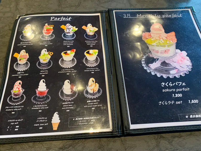 パフェもパンケーキも、テイクアウトが可能です。メニューには税抜き価格が記載されていて、店内飲食、テイクアウトで税率が変わります。ドライブ途中に立ち寄って、美味しいソフトクリームをテイクアウトするのもいいですね。