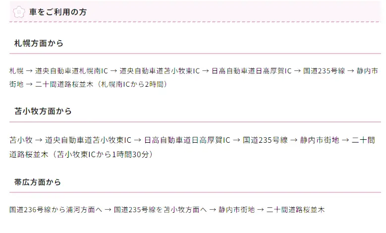 会場へのアクセスは、日高自動車道「厚賀IC」から車で約30分。札幌からは約2時間半の距離です。ただし、桜の満開時期は大混雑が予想されるため、以下の対策がおすすめです。