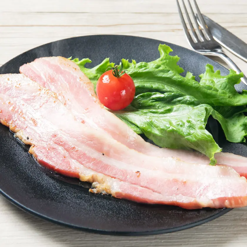 原料のバラ肉に塩等を直接すり込む乾塩法で塩漬熟成しています。十分に乾燥して仕上げているので、水分の少ない肉本来のうま味がぎゅっと凝縮しています!