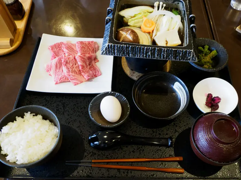 火が付いた状態で、卓上で完成させるスタイルです。お肉を卵につけていただきます。口の中にいれた瞬間お肉がとろけました。最後まで温かい状態で食べられるすき焼きはとても美味しかったです。また食べたいなあ。