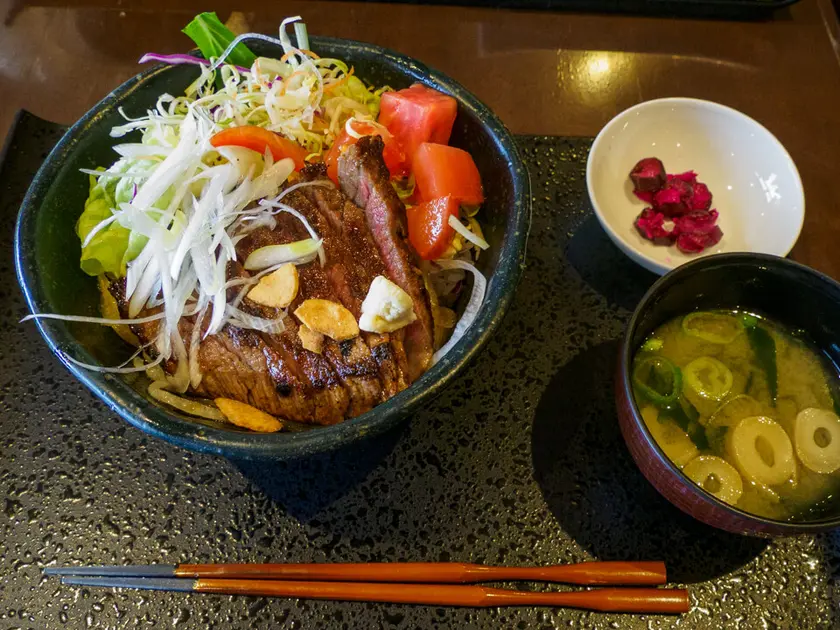 平取の名産のトマトものっています。お肉がやわらかい。添えられたワサビとの相性がバッチリ。赤身なので食べ応えがあってステーキソースがお気に入りです。おなかいっぱいです。