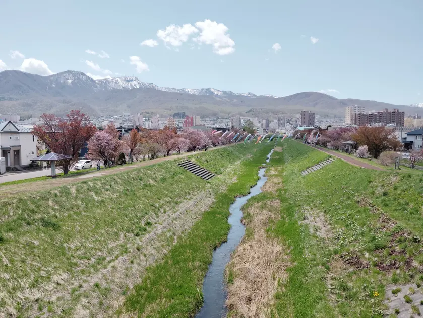 特におすすめのエリアが、遅咲きの桜並木と山頂に雪が残るコントラストが美しい「軽川(がるがわ)」。