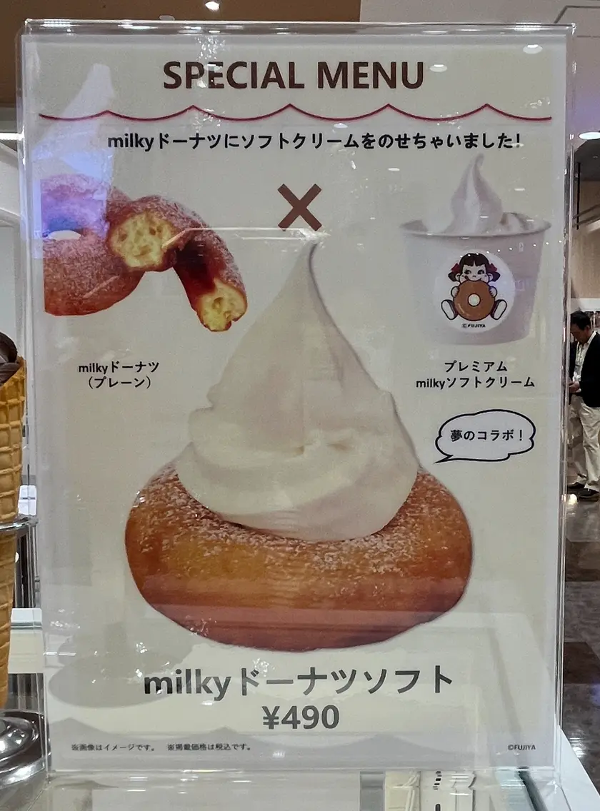milkyドーナツの上にプレミアムmilkyソフトクリームが乗った夢のようなコラボレーション!