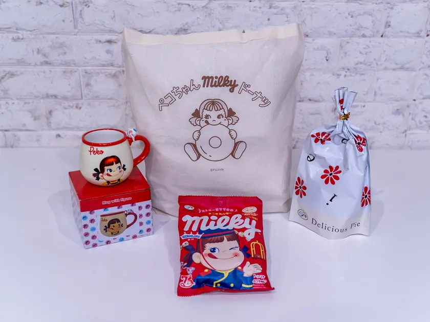 「ペコちゃんmilkyドーナツ」ロゴが入ったオリジナルのトートバッグに、「デリシャスパイ」や不二家のお菓子、グッズを詰め合わせた豪華な福袋。