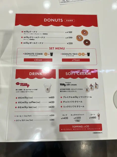 ドーナツだけでなく、不二家の店舗で販売している「プレミアムmilkyソフトクリーム」のほか、「のむmilky」も販売しています!