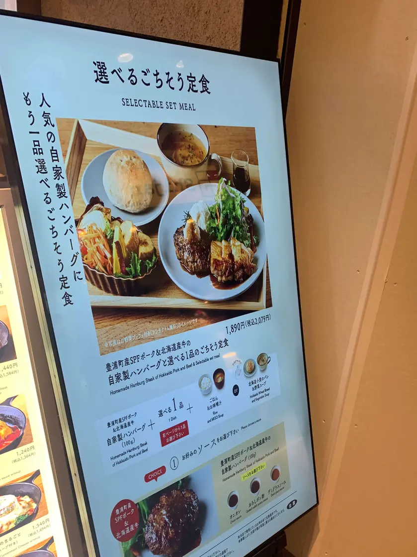 お腹が空いているときには、こちらの「選べるごちそう定食」がおすすめです。なんと、ハンバーグにプラスしてもう1品ついているボリュームたっぷりな定食です。大満足間違いなし。たくさん食べられる方はぜひ。