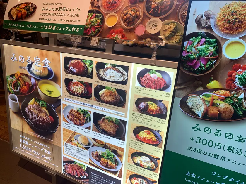 みのるダイニングのランチタイムサービスを利用します。定食メニューを注文すれば、通常330円(税込)の「みのるのお野菜ビュッフェ」が無料で付いてきます。