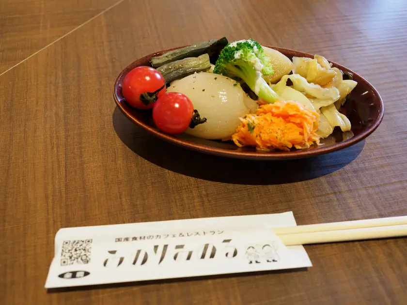 ランチタイムに定食メニューを注文すると、「みのるのお野菜ビュッフェ」が無料で付いてくるとのこと。野菜大好きなので、その素敵なサービスがとても気になりました。