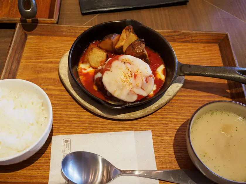 選べる5種類のソースからは、「トマトと焼きチーズ」を選びました。ハンバーグの上にのったトマトが食欲をそそります。