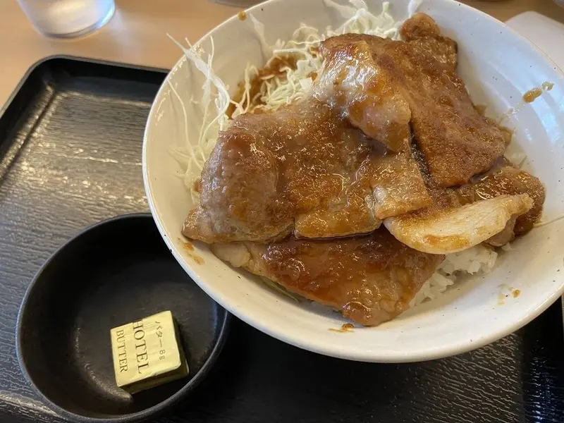「和風ポークカットステーキ丼」には、キャラメル包装の「ホテルバター」が添えられていました。