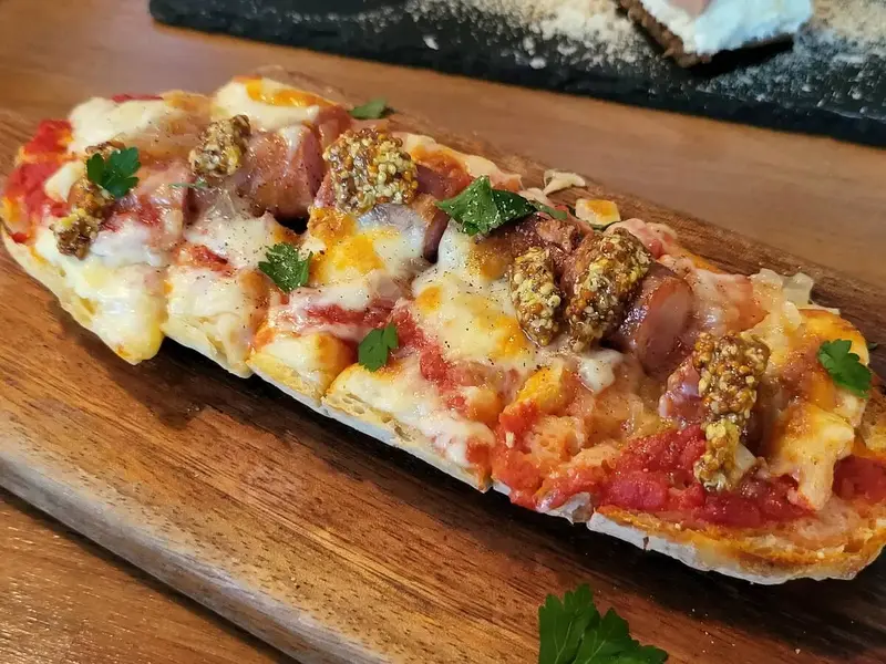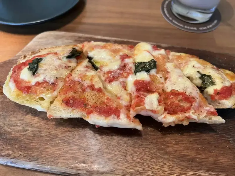 フランスパンのような生地の上にソースとチーズがたっぷり!