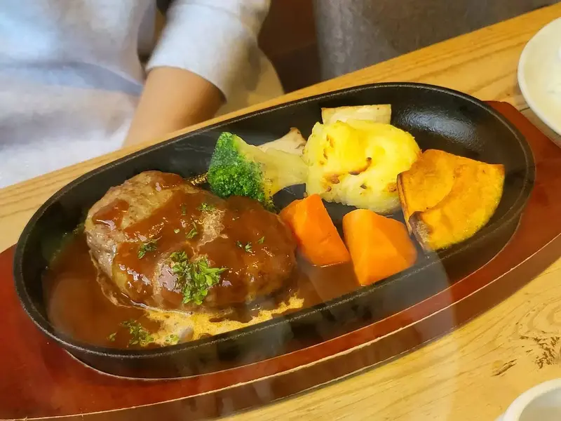 ハンバーグは肉厚ジューシーで、粗挽きなので食感も楽しめます。