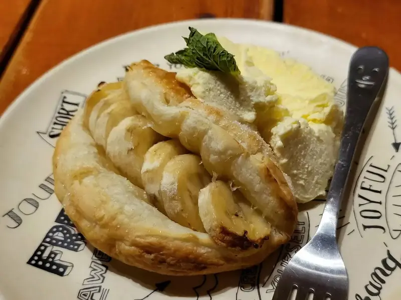 温かいパイの中にバナナが挟まっていて、冷たいアイスと食べるともう最高に美味しいんです♪