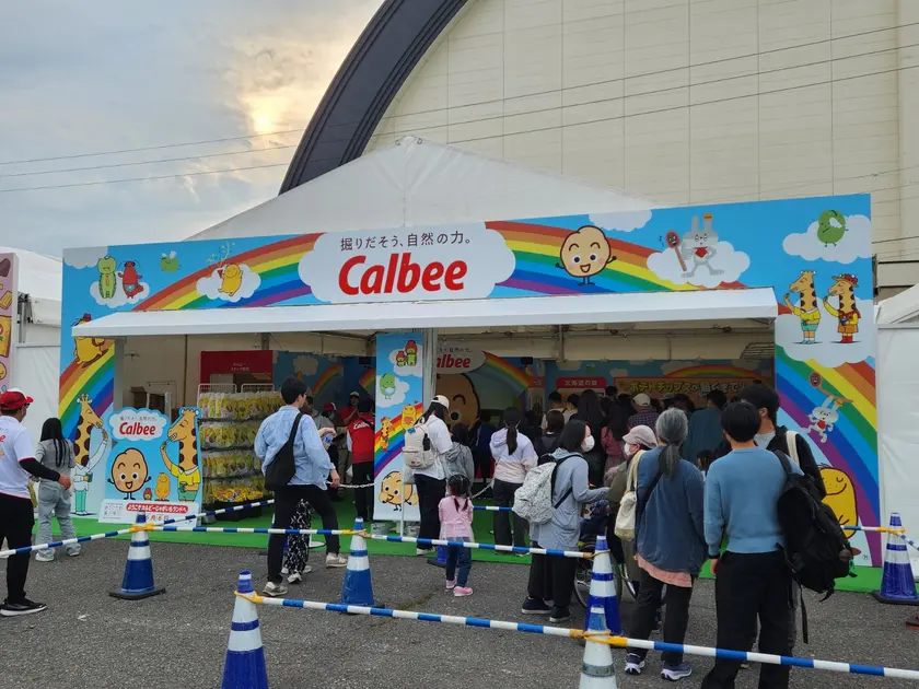 ポテ君の口をめがけてじゃがいもを投げるゲームに参加して、成功するとカルビー人気商品が詰め合わせされたバックがプレゼント。外れても参加賞があります。