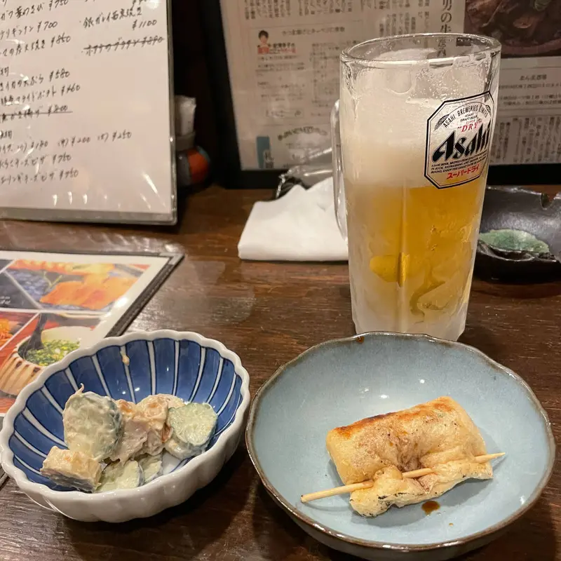この日のお通しは揚げ納豆ときゅうりとちくわのマヨネーズ和え。