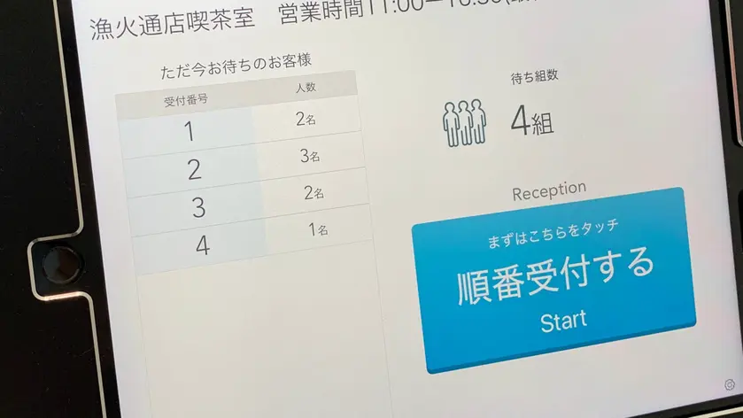喫茶室の開店は11時ですが、1階の売店は10時開店です。喫茶室が開店する11時よりも前にお店に到着しましたが、1階に設置されているタブレットで喫茶室の順番待ちが可能でした。