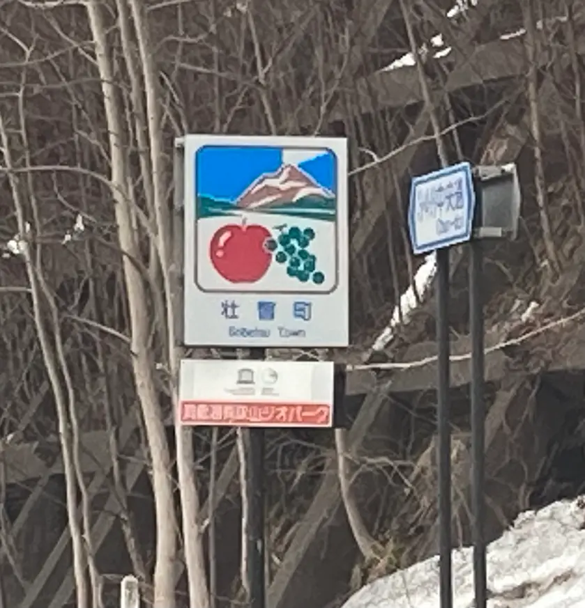 洞爺湖温泉で「今宵の宿は温泉宿に予約済み」と岸ディレクター(以降、岸D)から発表があり、ワクワク状態で歩いている先に見えた壮瞥町のカントリーサイン。