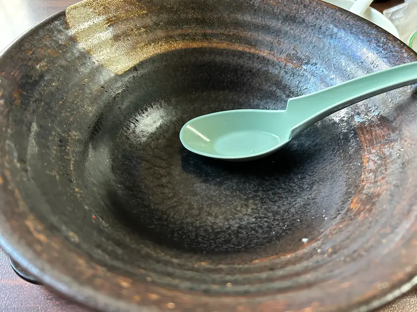 今回、私はスープにライスを投入して全部いただきましたが、『あさりらーめん』には穴あきのレンゲが添えられているので、スープを全て飲まない方も丼の底に沈んだアサリを残さず全部食べられます。