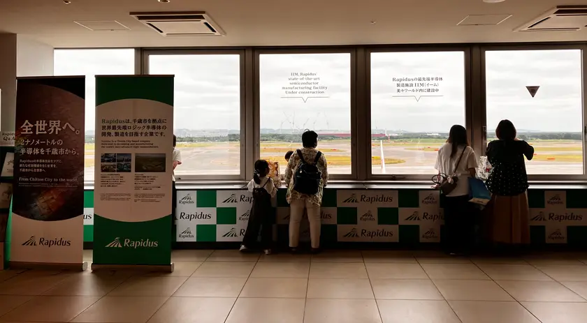 フードコート前通路のガラス窓から見えるのは、千歳市に建設された世界最先端ロジック半導体の開発・製造を目指す企業「Rapidus(ラピダス)」。景色のネタバレになってしまうのが嫌な方はパネルだけでも見て予習しておくのがオススメ。