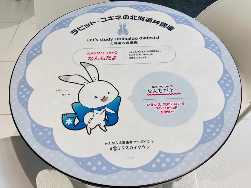 椅子とテーブルが5セットあり、テーブルごとに違う可愛らしいイラストと北海道の方言が描かれているのです。行った方のお楽しみということで、あえて全ては載せないことにしますね(^^)
