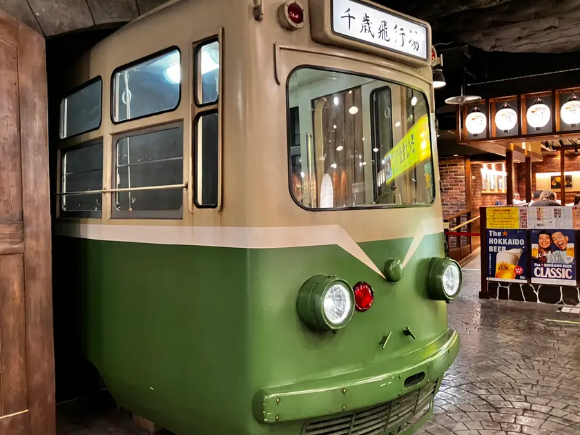 北海道産の食材を使ったメニューが豊富に揃う「市電通り食堂街」。雰囲気のある通路を入って行くと「千歳飛行場」行きの路面電車(レプリカ)が停車中。実際に乗ることができます。