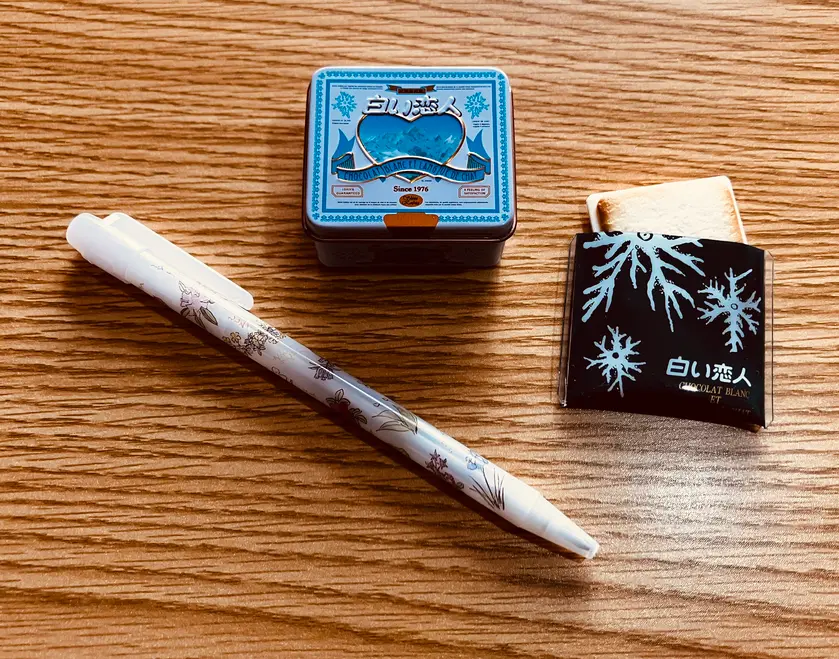 左:六花亭ボールペンは白○のところにあります。 右:拡大。マステも可愛い♡