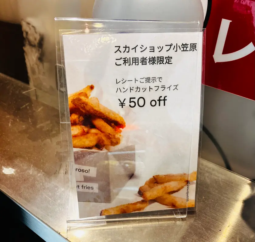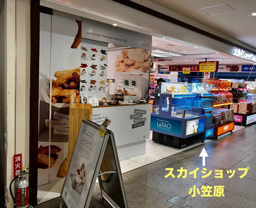 スカイショップ小笠原で買い物したレシートをお隣で営業している大人気のフライドポテト「アソンブロッソ!新千歳空港店」で提示すると50円引きになりまーす。