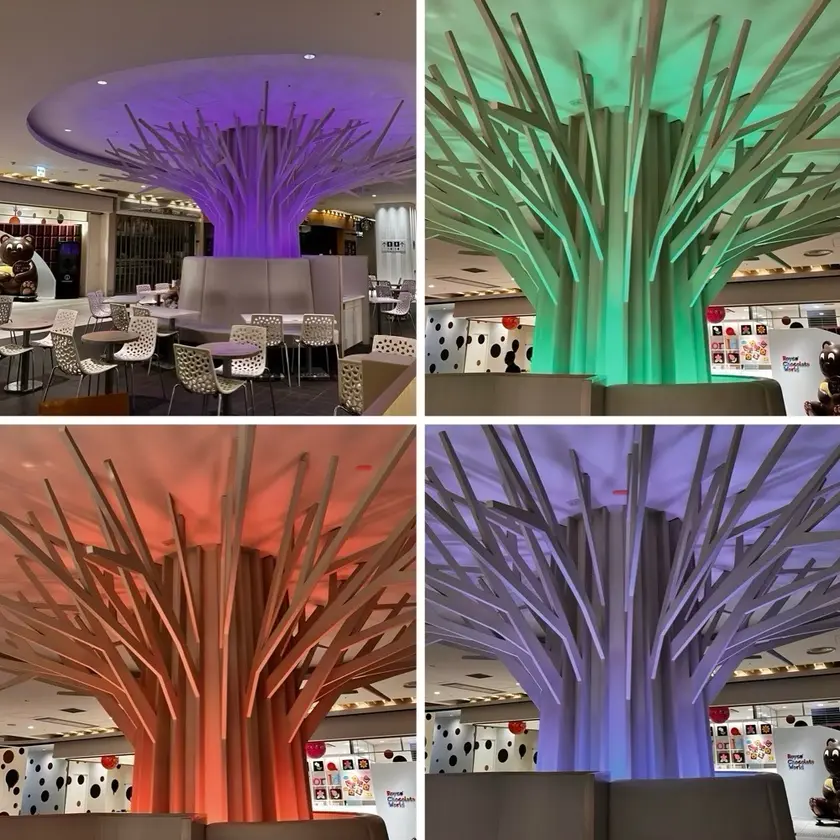 ロイズチョコレートワールド前の休憩スペース中央に大きな木のオブジェがあり、色がじわじわと変化するのです。少しずつ変わるので目を離さず一周ご覧下さいませ(^^)