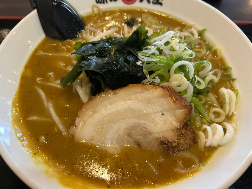 スパイシーでコクのある『カレーラーメン』。トッピングされている『もやし』と『わかめ』がすこぶるgood!増量して食べたい。