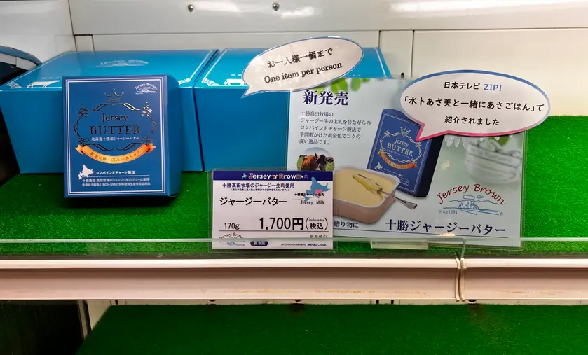 日本テレビ ZIP!「水トあさ美と一緒にあさごはん」で紹介された十勝高田牧場「ジャージーバター」も売ってました。1人1個まで。1700円税込。