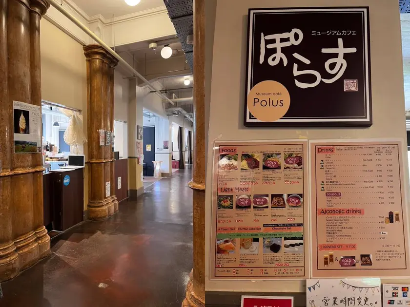 博物館の正面玄関から入って右手に進むと、左手に「ぽらす」の看板が見えます。看板下にはフードやドリンクのメニュー表が、近くには人気メニュー「西興部村のソフトクリー夢」の案内チラシが貼られています。