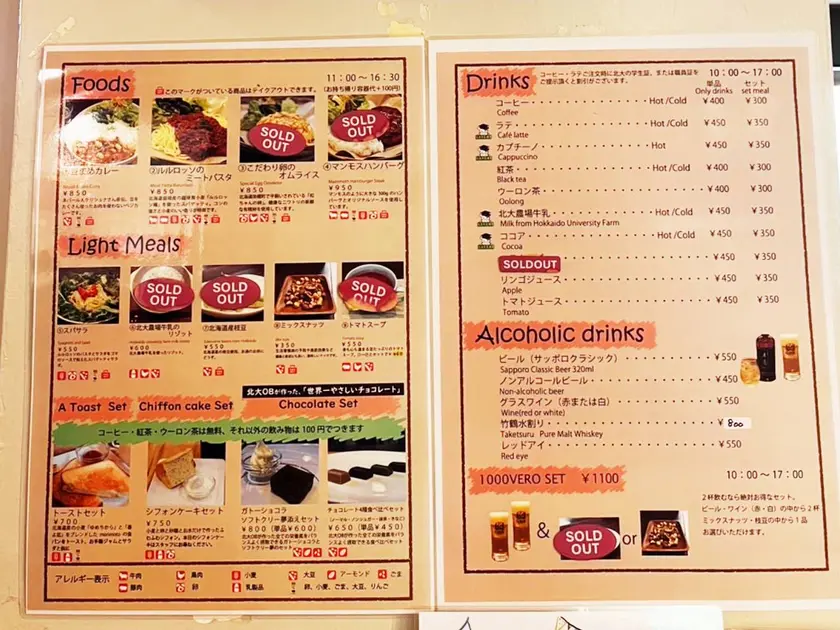 この日は平日にもかかわらず、14時近くには多くのメニューが売り切れとなっていました。お昼時で利用される方が多いのかもしれません。ドリンクメニューも豊富で、大学博物館ではありますがアルコールも提供されています。