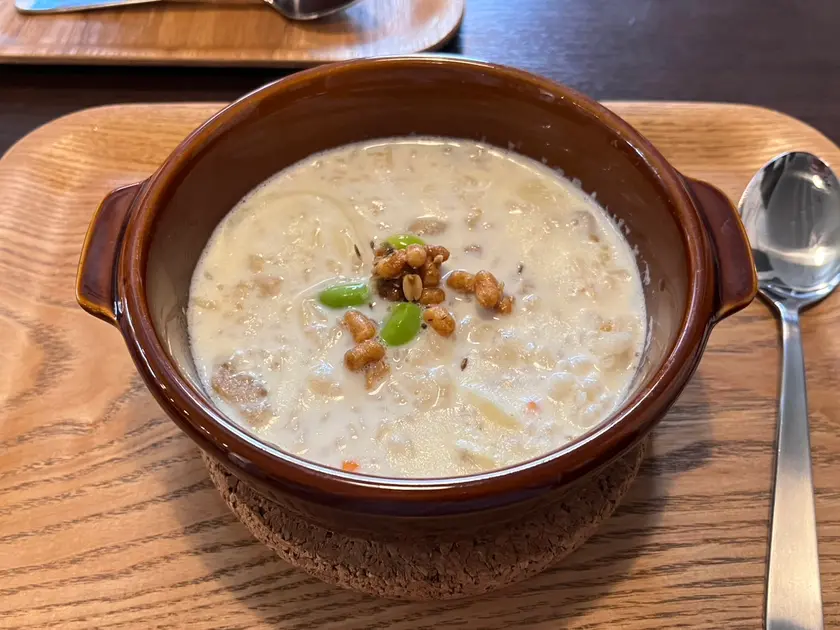 北大農場でとれた牛乳を使ったリゾットです。具材は玉ねぎやニンジン、豆類などバラエティ豊かで、牛乳のまろやかさが全体をまとめ上げています。食欲がないときにもぴったりな、胃腸にやさしい味わいです。