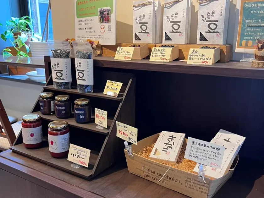 食器下げ口のすぐ右手には、こだわりの自然食品が陳列されています。どれもカウンターで購入可能です。