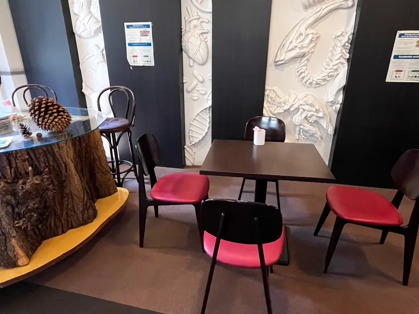 お店には入り口や出口がなく、開けた空間にカウンターやテーブルが設置されています。大学の総合博物館ということで、壁には化石や医学、植物、文明などを象徴するオブジェがデザインされています。