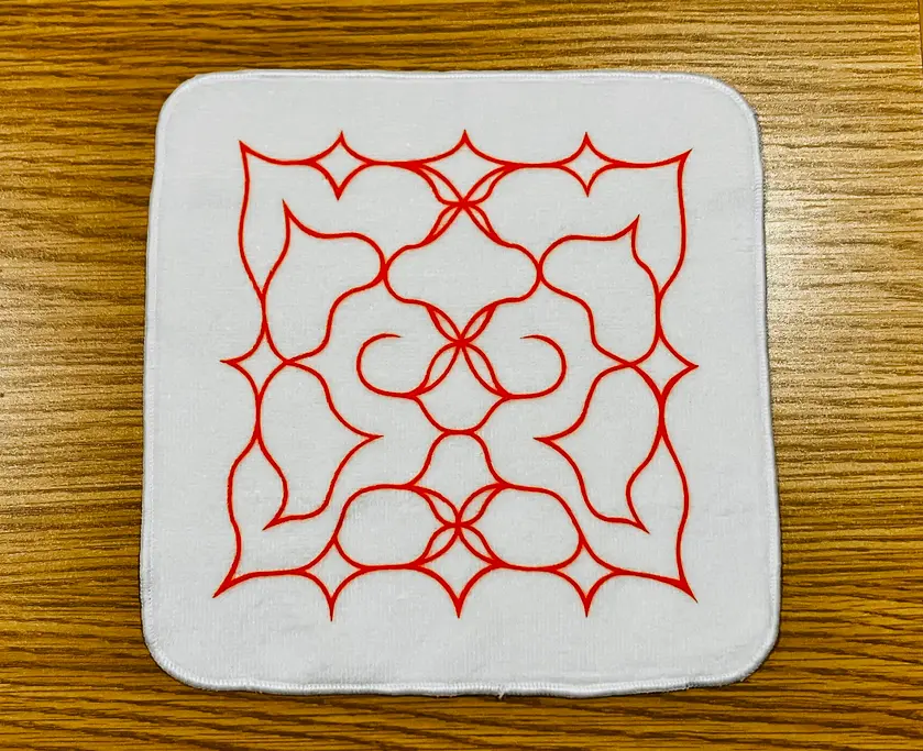 アイヌ文様は無病息災の願いが込められているそうです。ミニタオルは約20センチ角、肌触りの良いシャーリング生地。四つ折りに畳むとポケットに入るサイズで使いやすいです。1回300円。