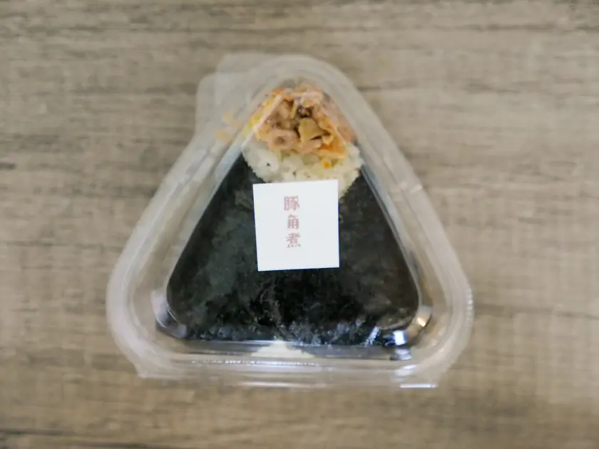 「豚角煮おにぎり」はひとことで言うと、“手で食べる豚角煮丼”。しっかり甘辛く煮込まれた豚角煮は、ほぐれ加減が絶妙!お米がやけにおいしいと思ったら、なんと石狩の浜益産!豊かな自然が育む甘みと香りが抜群で、炊き加減もふっくら!申し分なし。口にした皆さんはきっと、具のボリュームに驚くこと間違いなしです!