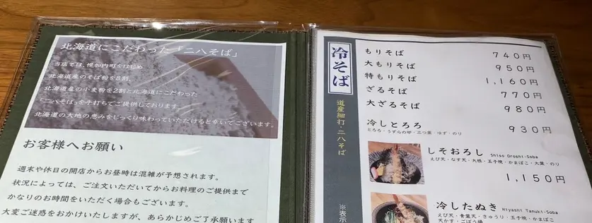 こちらのお店で食べられるのは、幌加内町をはじめとする北海道産のそば粉8割と、北海道産小麦粉を2割使用した手打ちの「二八そば」です。