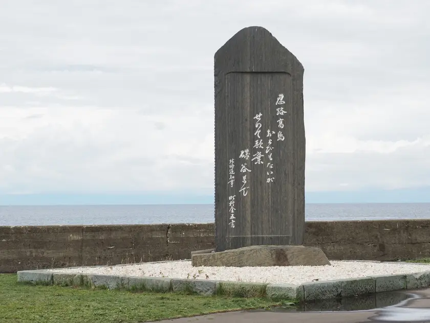 美味しいお蕎麦を食べ、再び車に戻る前に、少し外の空気を吸って休憩します。道路を渡った向かいには、広々と海が広がっています。ここは「歌棄(うたすつ)海岸」と言うそうです。お店の向かいは小さな広場のようなスペースがあり、追分記念碑と、隣に恵比寿神社がありました。追分記念碑には「忍路高原およびもないが せめて歌棄、磯谷まで」と、江差追分の歌詞の一節が書かれています。