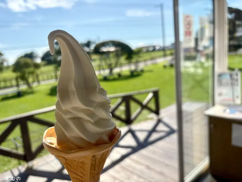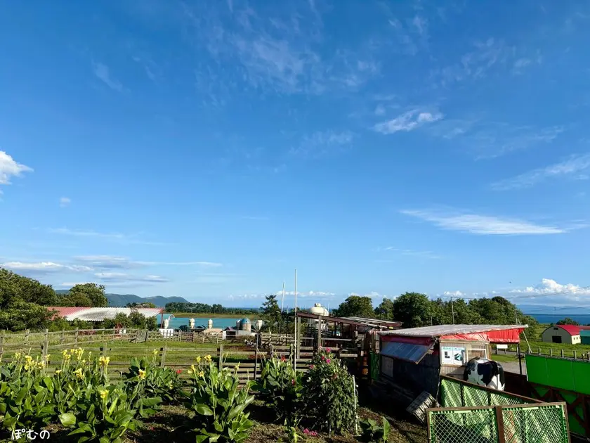 「あいす118」は函館空港から車で約5分の高台にあり、津軽海峡を見渡せます。周囲は牧場ののどかな風景が広がり、ソフトクリームを片手にベンチで休憩するだけでも癒しのひととき。景色を楽しみながらのんびり過ごせます。
