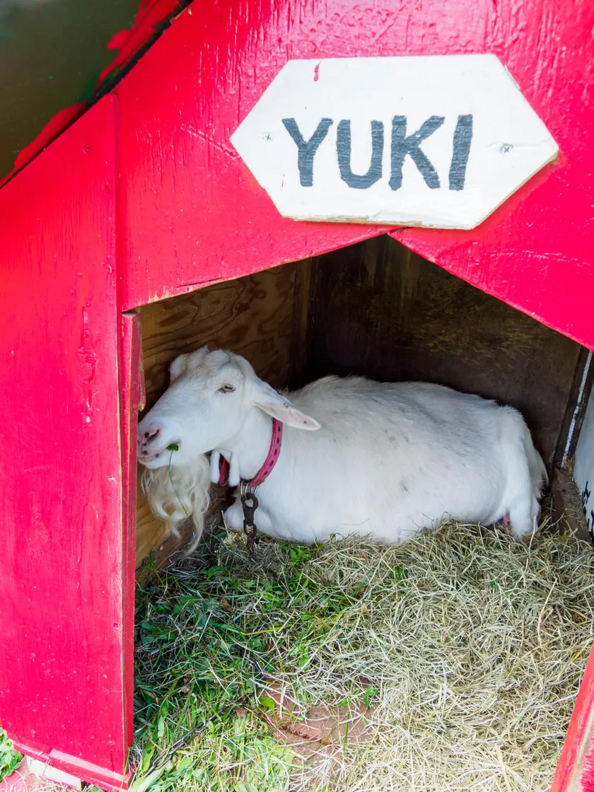 レークヒル・ファームの看板ヤギのユキちゃんにも会ってきました。赤いおうちの中で、草をモリモリ食べていました。かわいいです。