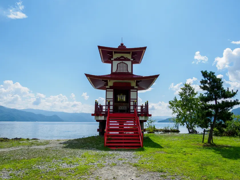 洞爺湖温泉街から車を走らせて、浮見堂公園へ。この浮御堂は、大正時代に旅の僧侶が残していった聖徳太子像を祀るために建造されたものです。2003年に一度落雷のため焼失してしまったそうなのですが、翌年に再建されたそうです。洞爺湖を背景にした赤い御堂が、力強く印象的でした。