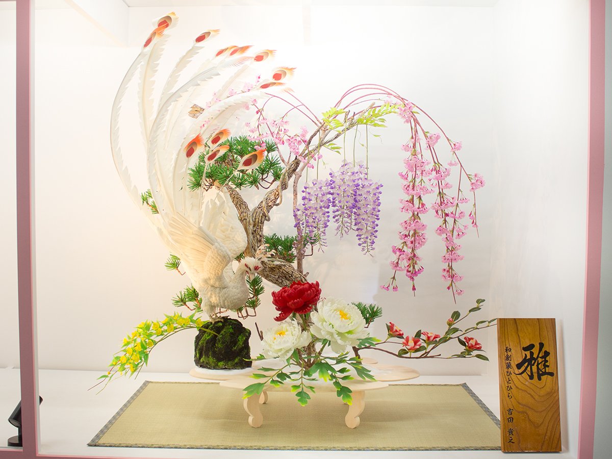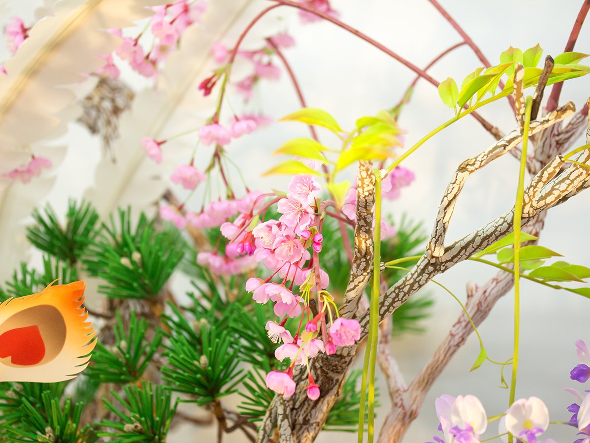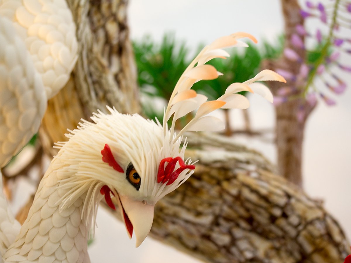 構想に1年、製作に6か月を費やしました。凛とした姿の鳳凰、力強く枝を広げる松、そして華やかに彩る枝垂れ桜・牡丹・椿・山吹̶。吉祥(よい兆し)の象徴である空想の鳥・鳳凰に、北海道菓子博の成功への祈りを込めました。