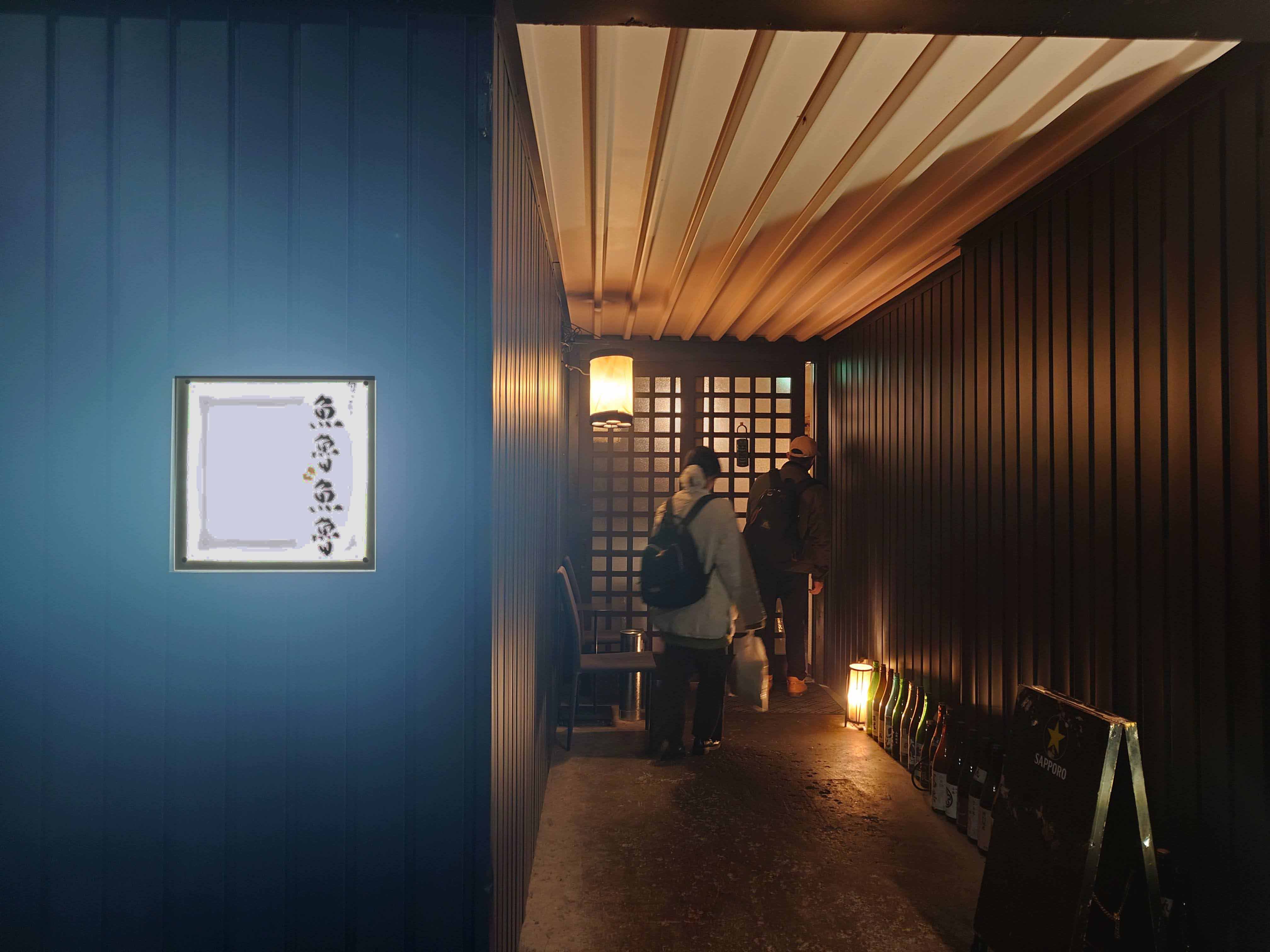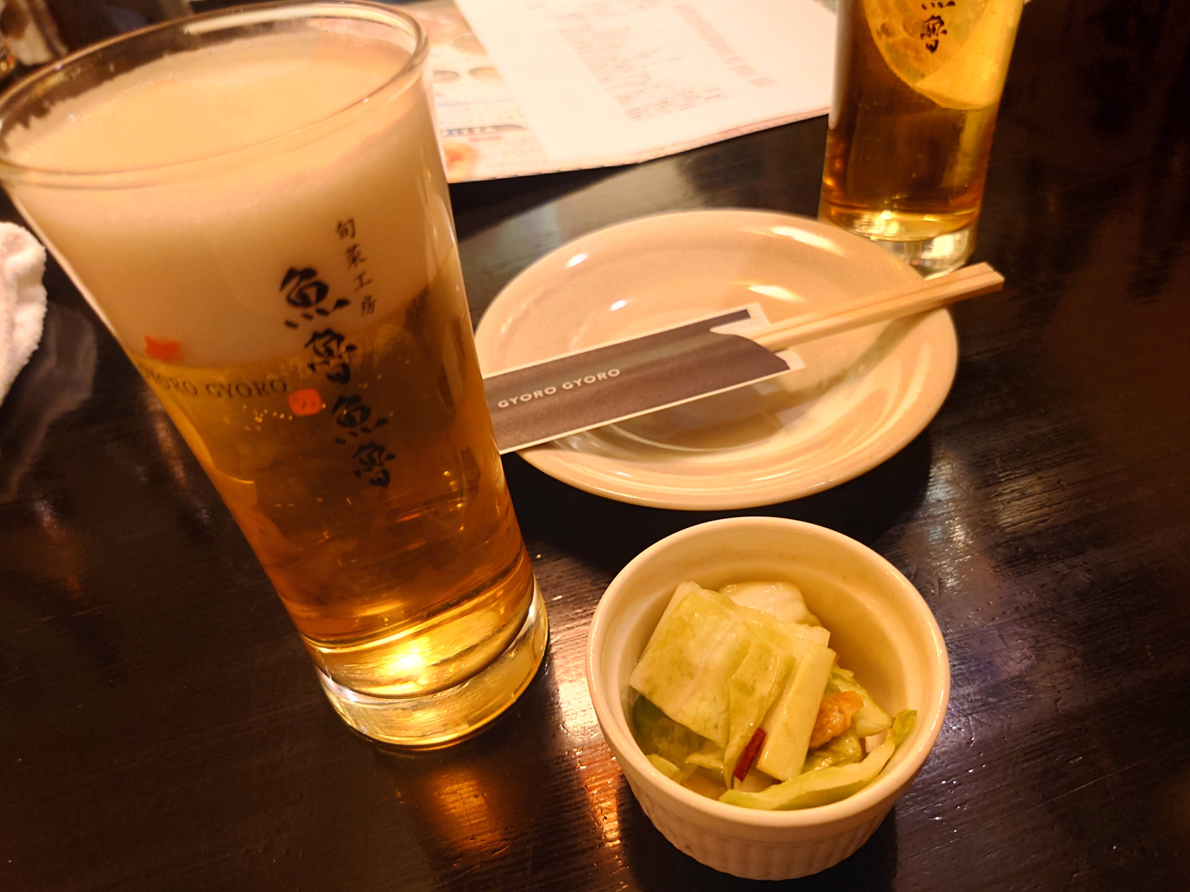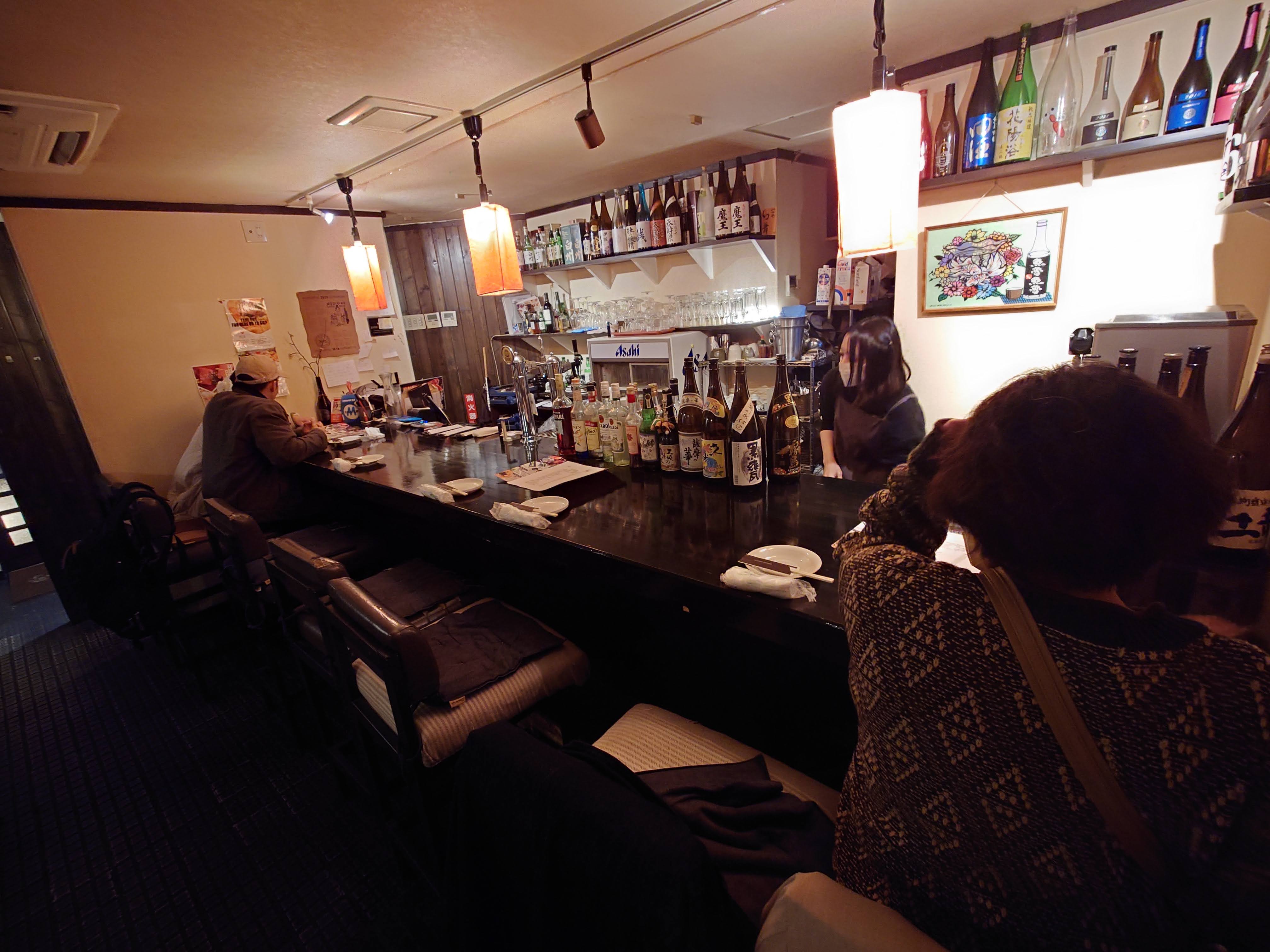 1軒目は「GYORO GYORO ふらの店。」駅から徒歩5分くらいのところにある居酒屋で、看板には「魚魯魚魯」とあって、初めは違う店かと思いましたね。パッと見は高級感ある雰囲気ですが、店内に入ると居酒屋とbarの間な感じです。